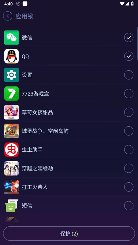 3、选择需要设置的软件,点击保护即可