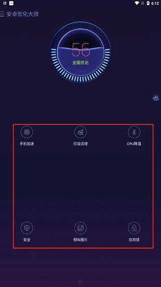 1、启动安卓优化大师手机端,其UI界面设计清爽简洁,各项功能清晰明了,让人一眼就能看懂。