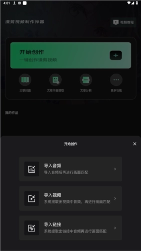 2、在这里是可以直接通过三种导入方式,可以导入音频、导入视频、导入链接,以导入视频为例子;