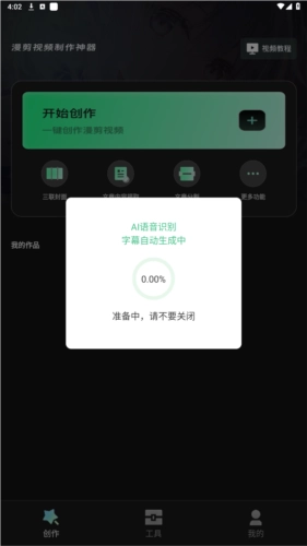 1、漫影快剪中在创作页面中点击开始创作按钮,点击右边的+按钮;