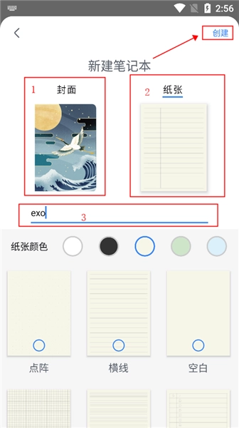 第三步:选择笔记本封面、选择笔记本纸张类型及颜色、填好笔记本名称点击“创建”即可