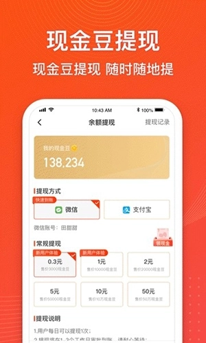 金猪记步是广州时秋网络科技有限公司推出的一款走路赚钱应用,用户每日行走即可积累现金豆,而现金豆支持提现兑换。这款软件的理念是让用户的每一步都创造价值,在收获健康的同时,完成每日任务还能赚取更多收益!走路就能变现,每日运动步数可直接兑换收益,提现秒到账,步数越多,收入越丰厚。通过步行运动,倡导绿色健康的生活方式。