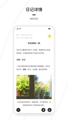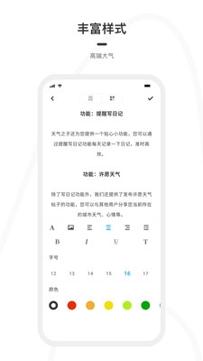 这款富文本日记功能完备,不仅支持文本的对齐、加粗、自定义颜色及大小写设置,还能实现图文混排,单篇日记最多可插入30张图片。