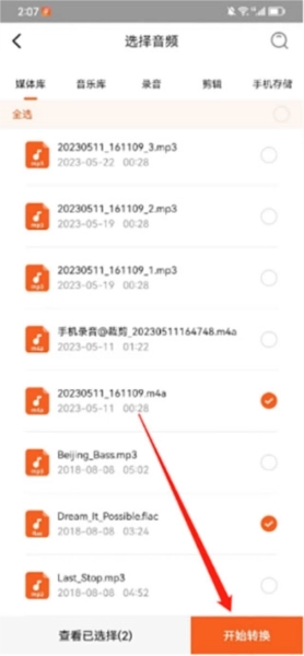 3、勾选需要转换格式的音频文件,可从媒体库、音乐库、录音、剪辑、手机存储这四个位置挑选,接着点击“下一步”。