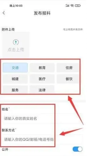 5.进入报料页面后,依次填写标题、内容,选择对应的报料类型,并输入姓名和联系方式,最后点击【提交】按钮即可。