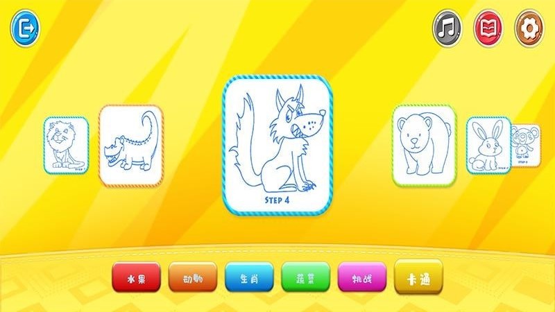 1、提供动物、水果、食品、交通工具、图形、数字等各种分类画板;