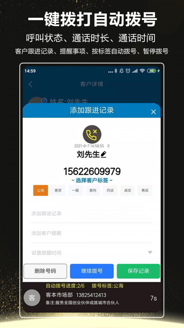 2、通话完毕后弹出跟进记录,更改客户标签、填写记录、添加客户提醒。