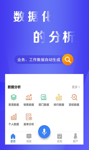1、在app的数据分析功能中,为用户提供了客源数据、销售数据、部门数据、排行数据、目标数据、个人数据、废单分析等等的功能可以进行使用。
