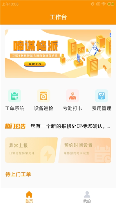 3.工单系统,设备巡检,考勤打卡,费用管理,热门公告,工单管理。