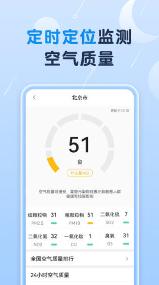 3、用户可以在软件中快速的完成各类天气内容的实时污染数据查询,为用户带来日常出行的生活指数建议,提供日常的出行穿搭指南等等的内容。