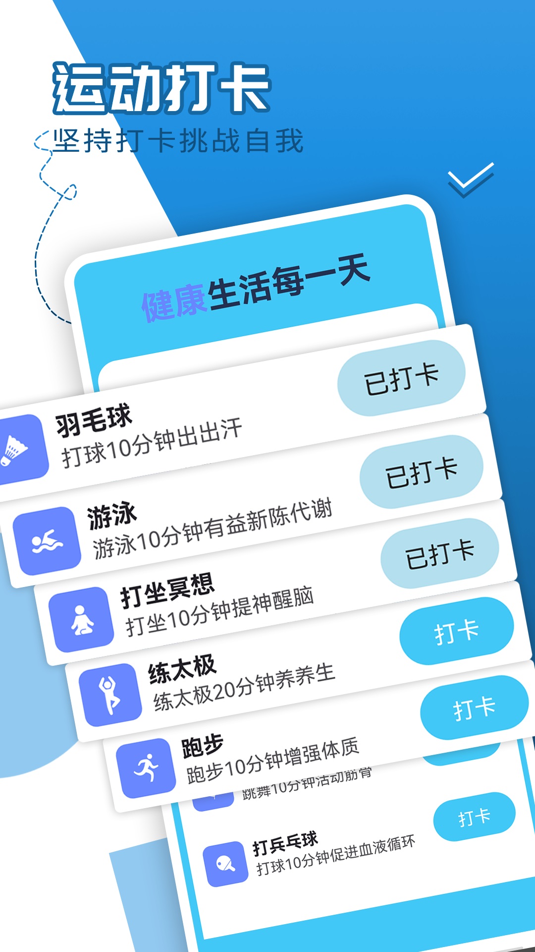 1、多种多样的打卡目标来激励用户养成健康作息和运动习惯。