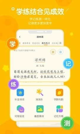 4、诗词赏析:每首诗配备释义、注释、拼音、朗诵、赏析等,帮助学生快速理解诗词;