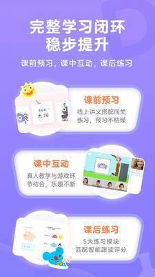 【完整学习闭环】通过"课前强预习—课中强互动—课后强复习"的学习闭环以及阶段性评测,搭配集听力、语音、词汇、语法、阅读于一体的练习系统,帮助孩子全面巩固学习成果