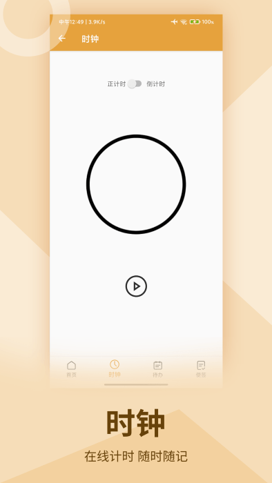 1、时钟的正计时、倒计时使用者可以自由设置,点击加号就能添加上你想记录的事项。