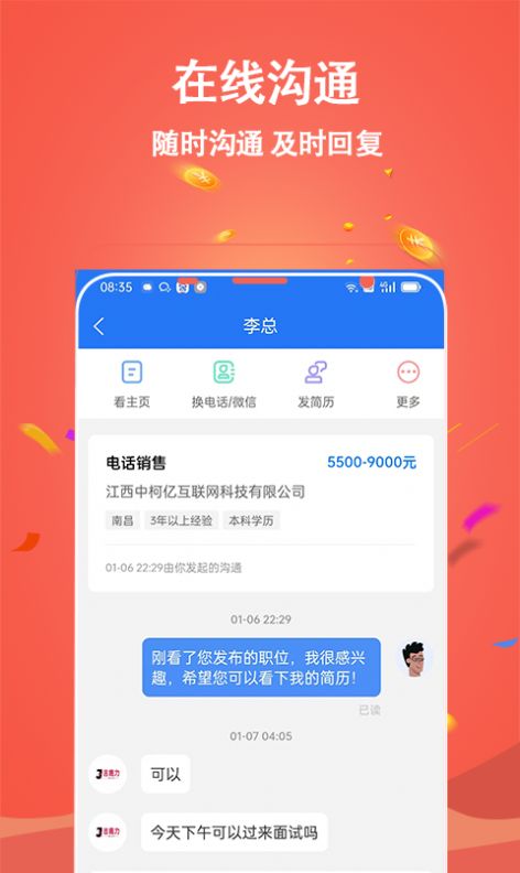 1、提供实时聊天功能,求职者和招聘人员可以直接进行对话,缩短招聘流程并增强沟通效率;