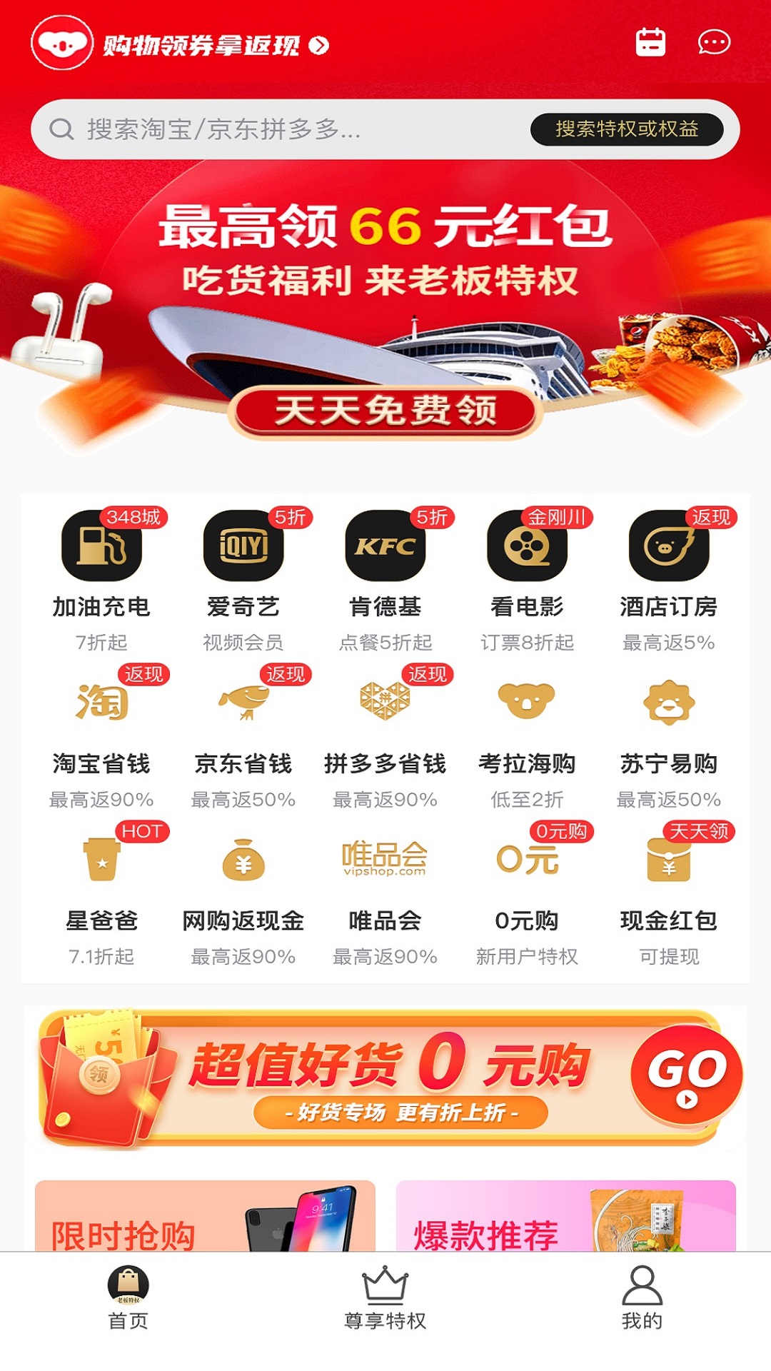 5、不仅包含淘宝省钱、拼多多省钱、加油优惠,还集成了大量的出行、吃喝、影音娱乐和读书学习等特权。吃喝玩乐购尽在老板特权app。