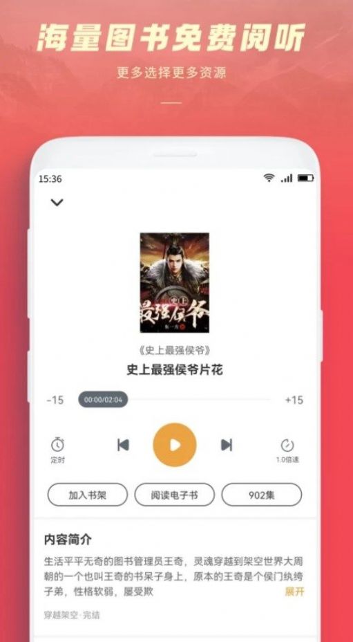 1、是一款集有声阅读、听书、播客等多种音频服务于一身的全方位语音软件,随时便捷聆听;