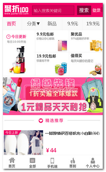 聚折100快捷方便,省钱省时。都是精选高品质产品,想你所享,购您所够!美妆、数码、女装、男装、鞋品、箱包、居家、母婴、美食、文体和家电等集成一体,品类齐全,优惠到家。我们天天有更新,天天有优惠,欢迎大家购买到高品质的产品。网站特色有9.9包邮,1折,秒杀,团购,免费试用,积分兑换,品牌特卖等等,欢迎大家光临本站。另外本店向淘宝和天猫招商,限时免费上活动,赶快报名吧!