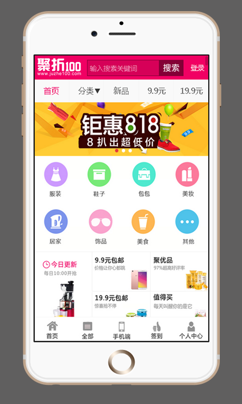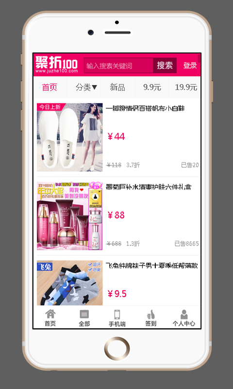 聚折100快捷方便,省钱省时。都是精选高品质产品,想你所享,购您所够!美妆、数码、女装、男装、鞋品、箱包、居家、母婴、美食、文体和家电等集成一体,品类齐全,优惠到家。
