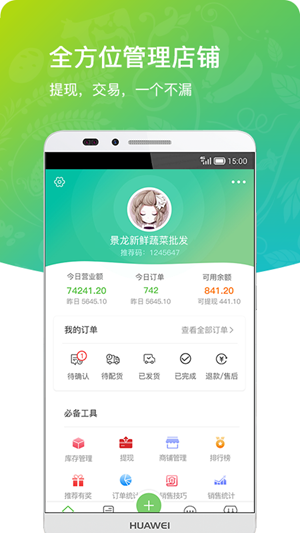 所有的订单详情能够一目了然地呈现出来,用户可以掌握各个商品的库存情况,当有新的订单时,库存自动减少,方便用户更好的销售,可以添加多个不同的店铺,自由切换不一样的店铺,查看每个店铺的经营状况。