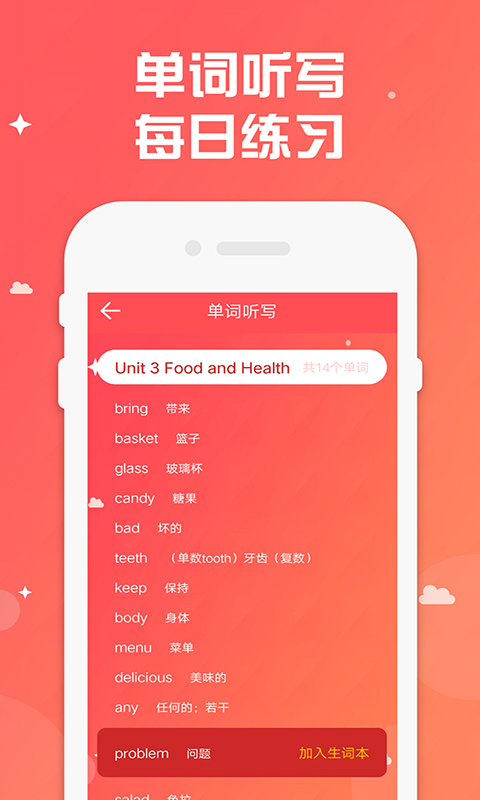 2、包含跟读,听写,填空,口语练习,试卷,默写,错题集功能。