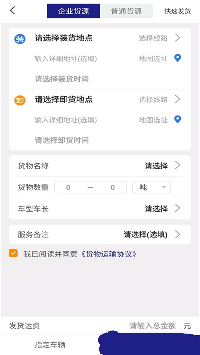 3、根据货源数据进行填写,选择装货和卸货地点以及货物名称和数量等内容,自由选择车型运输,专业物流司机接单运输。