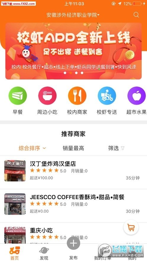 校虾应用作为专业服务于大学生的轻生活,可以实现校内商家外卖点餐(包括食堂)、校门口商家外卖点餐。