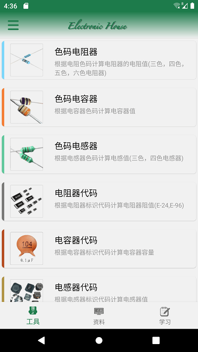 1、电子家是一款简单易用的电子电器元件信息查询APP。其主要功能包括色码电阻计算、色码电感计算、