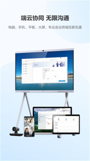 1、跨平台在线会议聊天,PC、移动端均可加入会议,专业会议终端、智能协作大屏也可加入;