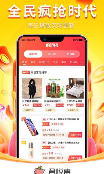君悦惠是一款能够让用户享受到平台百亿补贴的应用购物服务软件,使用该软件的用户可获取到最热门的商品限时抢购福利,各种限时商品折扣或者直接秒杀,购买商品可返赠积分福利来免费兑换各种好礼,每天都有丰富的活动内容玩法和提供非常安全正规的交易渠道,让你享受到购物的质量体验。