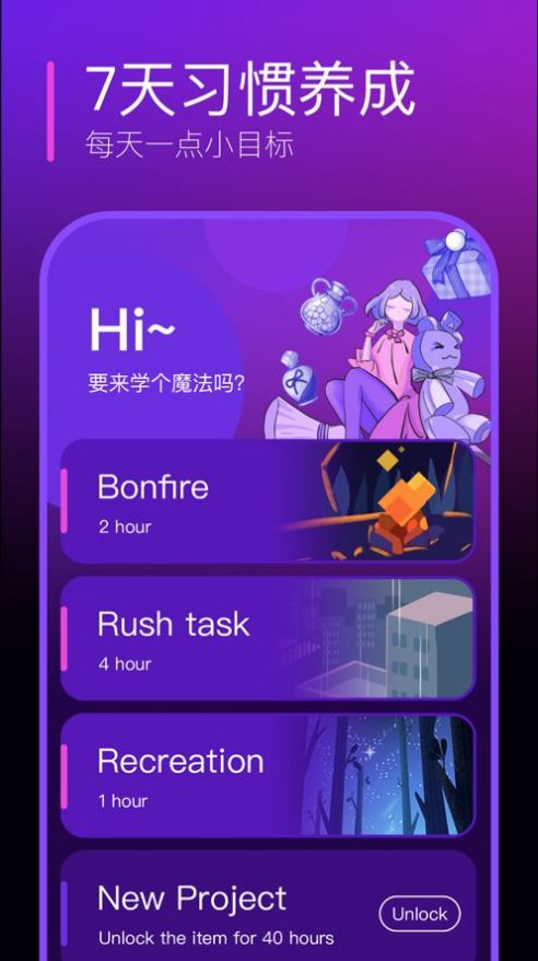 独设专注时刻,根据目标设定时间自动记录进度完成情况;更有专注屏幕锁定功能,暂时杜绝手机干扰,提高效率;