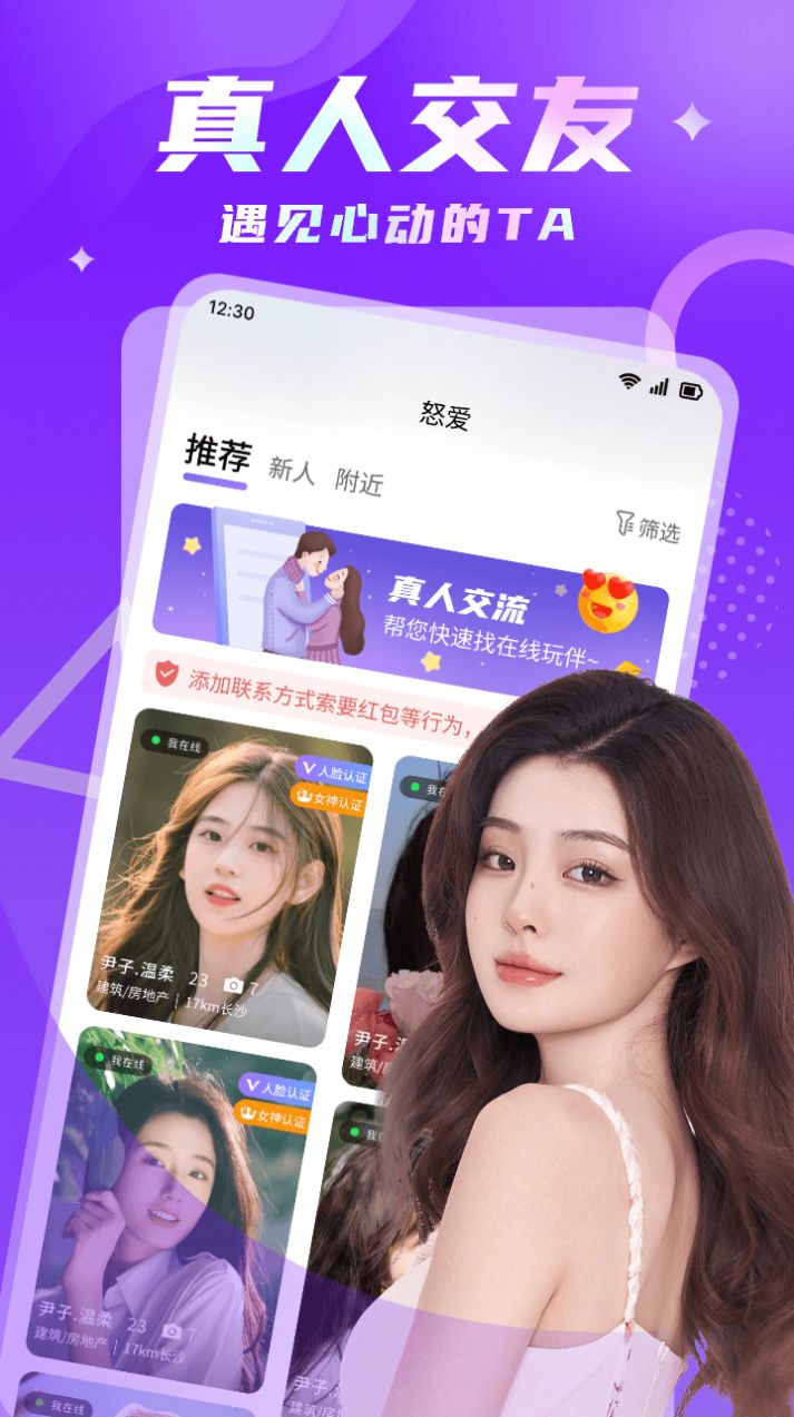 怒爱是一款社交交友软件,软件内的社交模式都是免费的,用户可以使用软件认识更多的同城好友,软件内的用户质量相当不错的,而且信息都是真实可靠的,用户可以放心的使用,丰富的社交话题,让用户可以认识许多志同道合的好友,想要脱单的用户赶紧来试试吧。