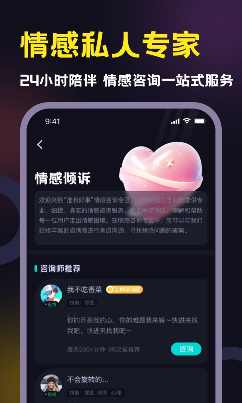 准有好事是一款专业的心理健康咨询服务平台软件,该软拥有非常多专业的心理医疗健康咨询师,可为你提供线上连线咨询和视频的功能,可以科普更多和心理疾病相关的智商,有专业的智能AI为你24小时听歌一站式问题解答服务,还专门准备了晚间深夜电台,有需求的用户可以来尝试咨询体验一下。