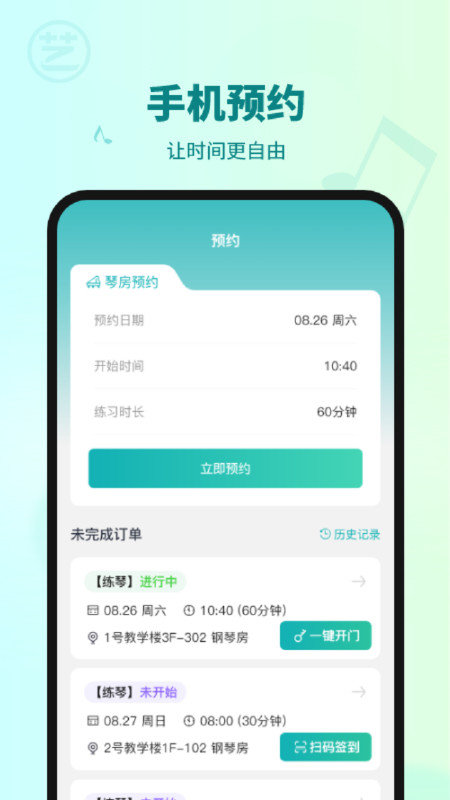 2、让学生们更好的安排时间练琴,支持一键开门。