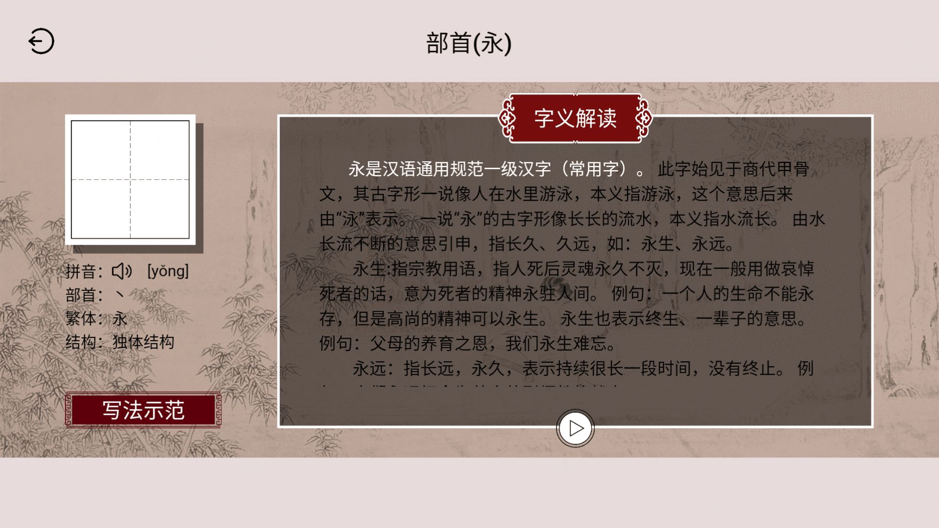 3、提供了汉字结构和释义,实时给大家讲解,提高大家书法技巧。