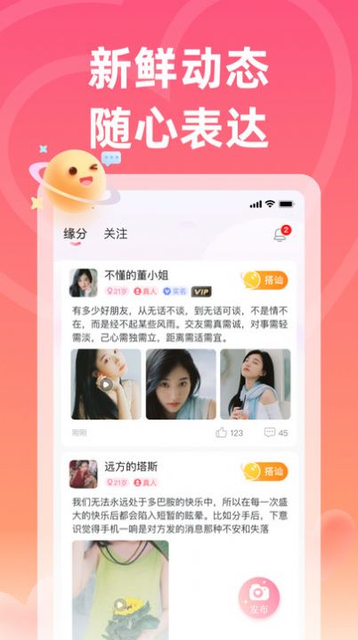 1、舒适的聊天模式实时开启,轻松偶遇你的专属伴侣;
