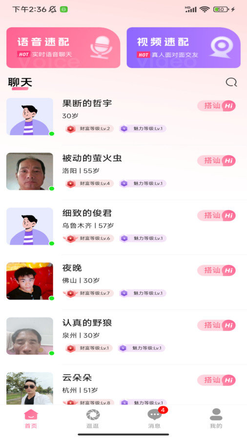 2、首页有语音速配、视频速配模式,系统会根据个人的交友需求,进行筛选