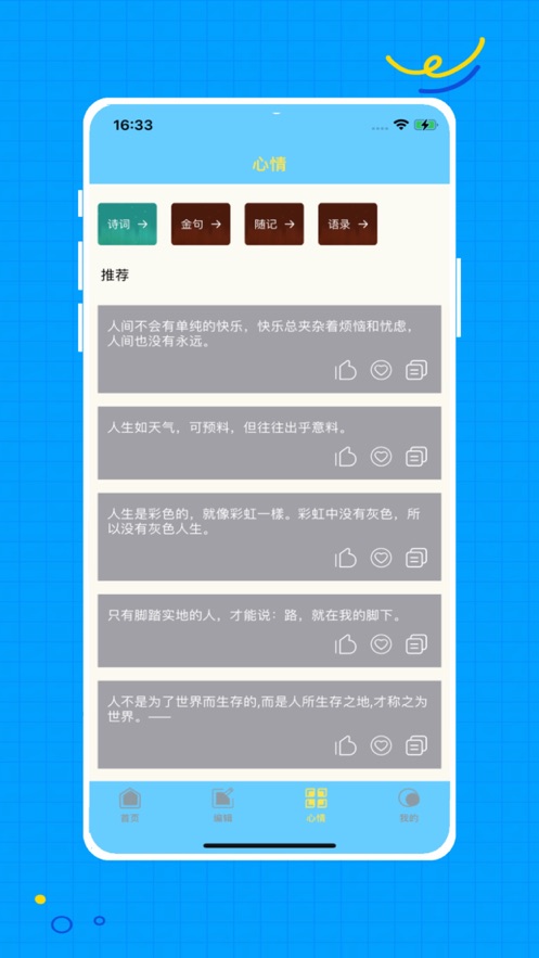 每天更新不同心情的诗词、金句、娱乐等,可提供复制使用。