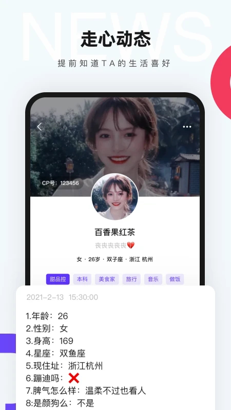 CP是一款能让每个人都找到自己的真爱的软件,同时其中有许多交友的方法,有意思的一周CP关系更为有效,会根据用户们的简介与需要,自动为其配对,让用户迅速认识,同城线上交友聊天更加轻松,还有超多的交友聊天方式更加丰富,全天都有大量的社交方式和风格更为有效果,自动一键匹配,给你不一样的交友活动。