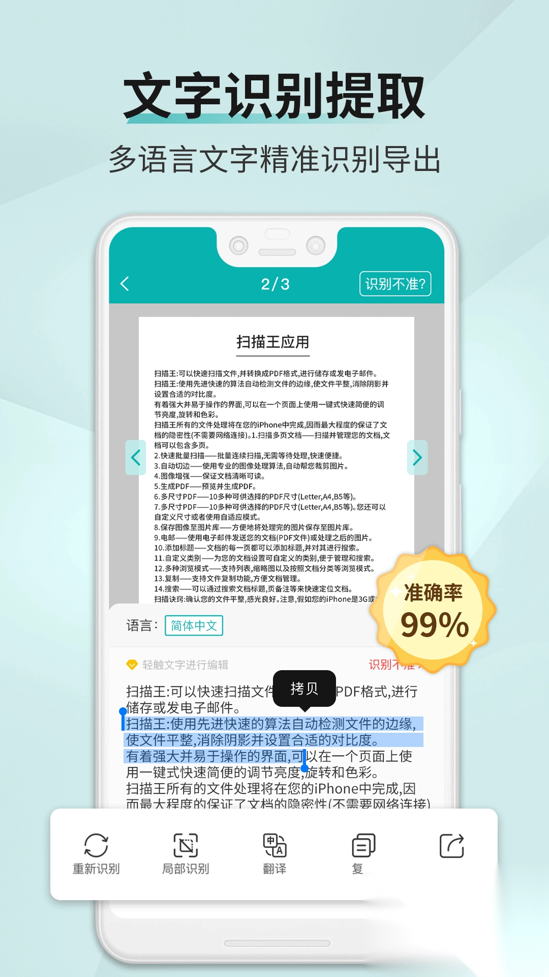 1. 具备多张识别功能,可自动选取识别内容并转化为PDF格式或扫描件。