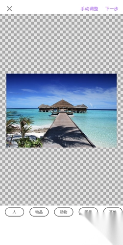 7、如果用户们选择的是AI抠图,则在导入图片后,我们需要点击下方显示的人、物品、动物、图章、其他、室内、室外来挑选图片中需要抠选的主体。