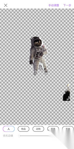 8、选择完成后,系统会自动将主体抠出来,然后我们拖动下方的优化边缘滑块,来对锯齿部分进行优化即可。如果还有没有抠选的位置,可以点击右上角的手动调整来动手操作。