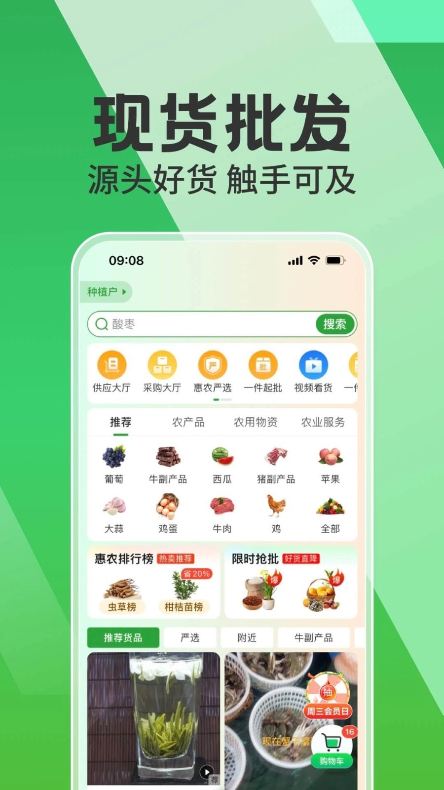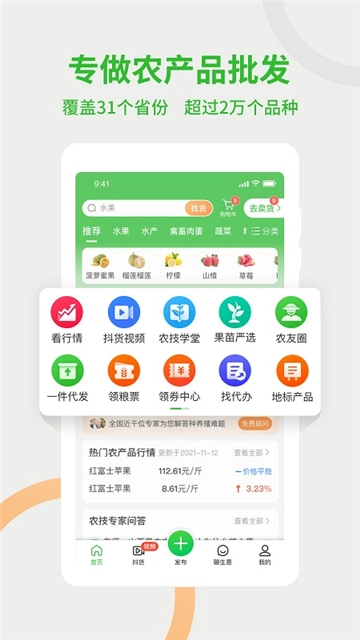 1、现货批发:包含水果、蔬菜、禽畜肉蛋、水产等共计19个大类,品种数量超2.1万,可满足多样化需求。