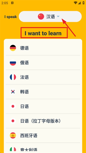 2、在语言选择界面,选母语后点击【Iwanttolearn】选目标语言。