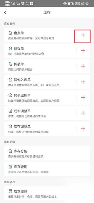 二、点击你想要调整库存对应的后方加号,例如盘点单 。