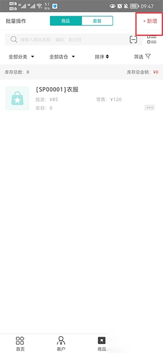 一、打开管家婆软件手机版,在商品界面中点击右上角新增