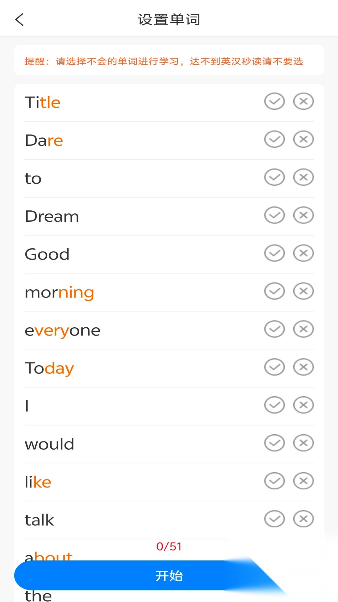 2、选词以一眼会为标准,支持选5的倍数单词,灵活定制学习内容。