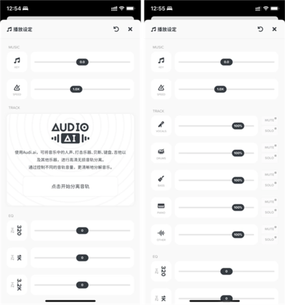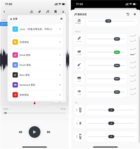 4、若想对当下的音乐进行分离操作,需点击右上方的「播放设定」。在此界面中,我们能看到「TRACK」处的「AUDIOAI」。借助这个功能,我们可基于人工智能更高效地分离乐器音轨。点击该功能后,音频文件将被上传至云端进行分析,随后生成的多个音轨会被下载至本地,从而完成音轨分离。