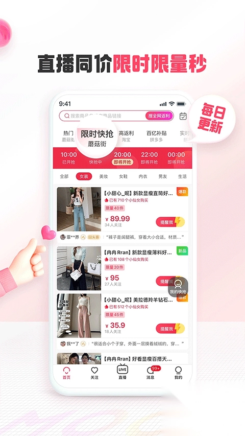 蘑菇街 2025 最新版,专为女生打造的一站式购物消费平台。平台汇聚上万精通购物与穿搭的时尚达人,每日于直播间推荐当季值得入手的时尚单品,以及限时折扣的品牌好物,更有源自工厂的高性价比商品。这里所有商品,官方都会严格审核供应商资质与品质,让消费者轻松畅享可靠的变美之旅。软件能助力用户挑选衣服,解决各类搭配难题,化妆品种类丰富多样,还可为顾客提供诸多购物建议,无疑是口袋购物的不二之选。