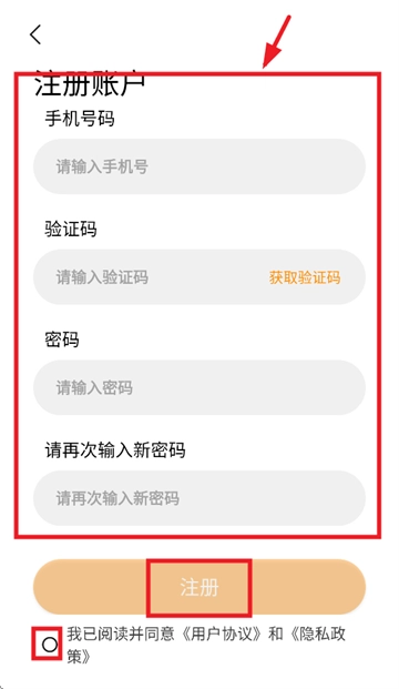 进入注册界面后,输入手机号,验证码,密码,勾选我已阅读并同意 《用户协议》和《隐私政策》,点击注册即可